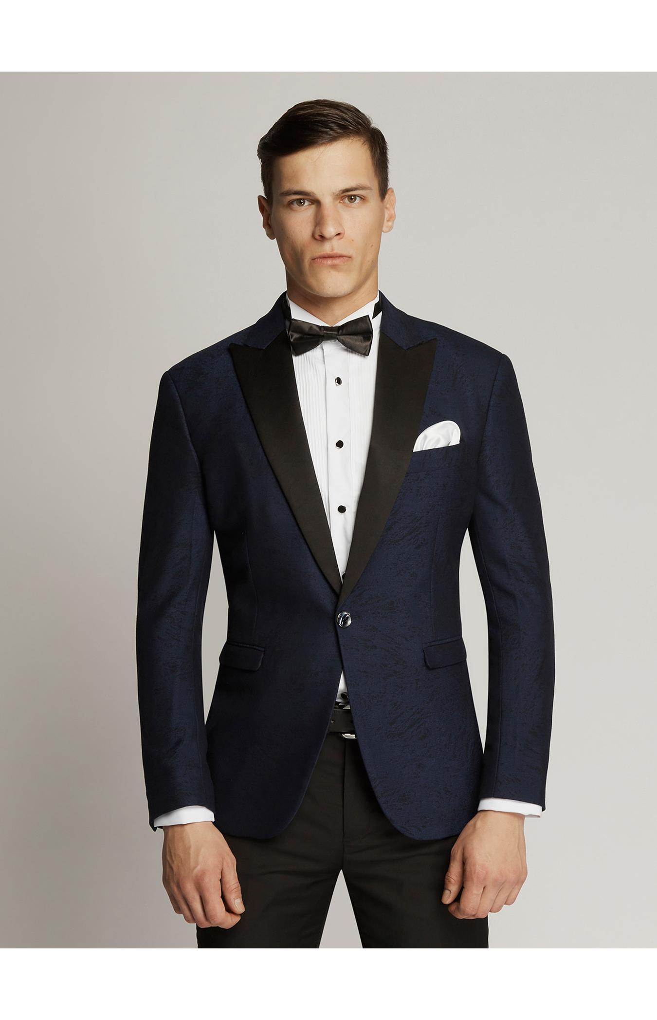 Slim Fit – single-button jacket, broad satin peak lapel, single back vent, satin-trim flap pockets and welt breast pocket.